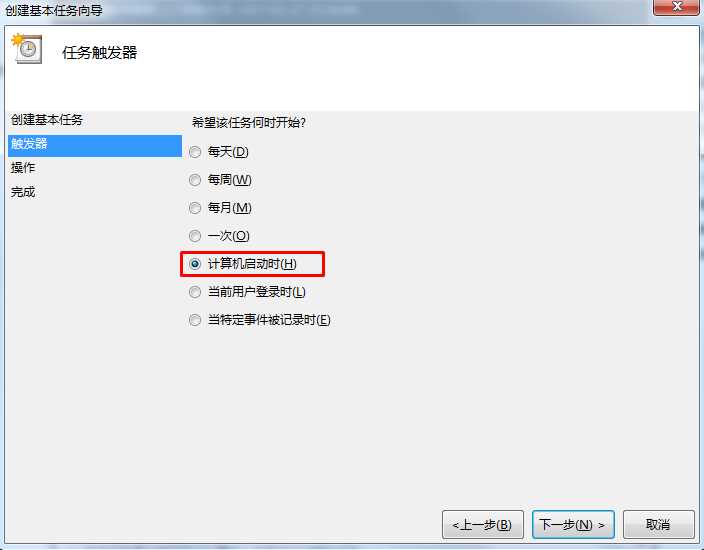 5、触发器设置为计算机启动时,或者按时间、每天、每月,如果设置为按时间启动,那么还需要设置一下开始时间;