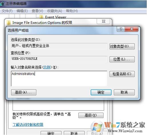 5、然后点添加,输入当前的系统用户名如Administrator ,然后点确定,添加之后还要设置完全控制权限。
