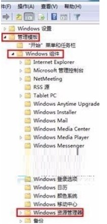 2、在编辑器中依次展开“用户配置—管理模板—Windows组件—Windows资源管理器”;