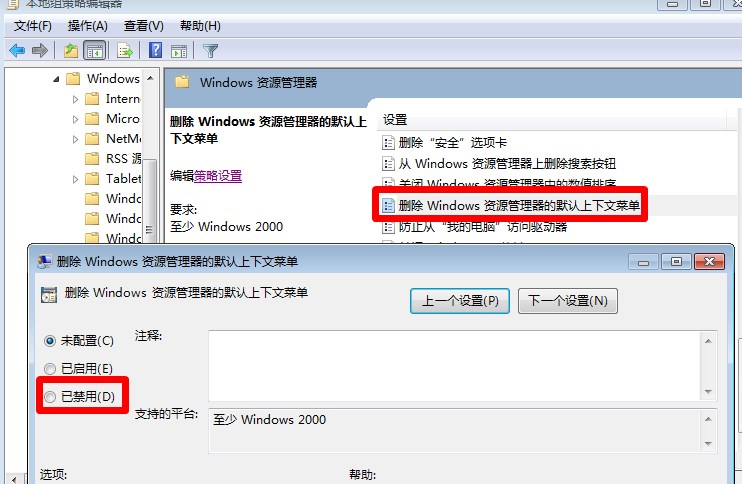 3、在窗口右侧双击打开“删除Windows资源管理器的默认上下文菜单”,在打开多窗口中选择“已禁用”,点击应用并确定即可。