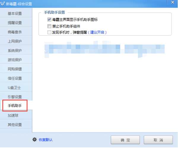 首先我们将新毒霸升级至最新版之后,在新毒霸综合设置里面,有手机助手设置选项,如下图所示: