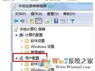 步骤二:先打开“本地组策略编辑器”的页面,我们在左侧表中找到“用户配置”;