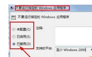 步骤四:按照上述步骤依次打开后,在右侧双击打开“不要运行指定的Windows应用程序”,在打开的框中选择“已禁用”然后点击应用并点击确定;