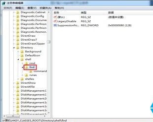 2、在打开的“注册表编辑器”窗口,依次展开HKEY_CLASSES_ROOT\Directory\shell子健,将shell栏目下的find子项删除,如图2所示: