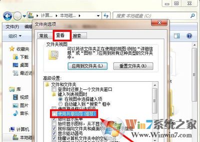 2、打开之后,选择“查看”选项卡,将“使用共享向导(推荐)”前面的勾去掉,确定,如图所示: