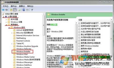 2、在本地组策略编辑器窗口中,依次展开至“计算机配置》管理模板》Windows 组件》Windows Installer”,在右侧找到并双击打开“允许用户对安装进行控制”;