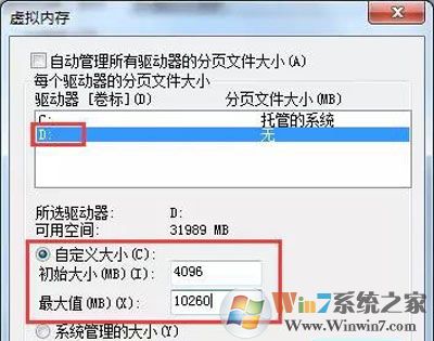 4、选择DNF安装目录→自定义大小→初始大小(4096),最大值(10240)→再点击确定,根据系统提示重启电脑一下。