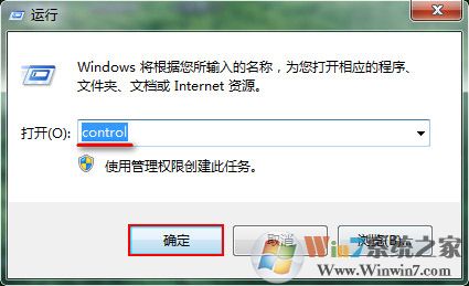 2、在运行窗口输入“control”命令,按下“确定”按钮,如下图所示: