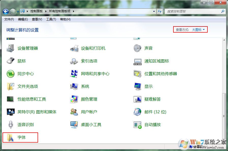 3、把弹出窗口左上角的查看方式改为“大图标”,然后找到“字体”项,如下图所示: