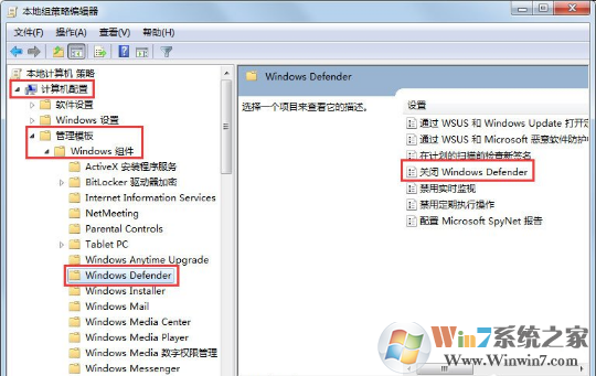 二、 在弹出的本地组策略编辑器中,依次展开“计算机配置管理模板→Windows组件→Windows Defender”,然后在右侧窗口双击打开“关闭Windows Defende”。