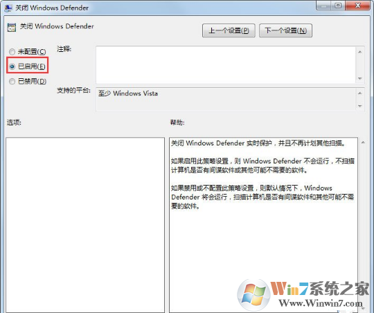 三、在关闭Windows Defende中,将其配置为已启用,然后点击确定。之后重新进行Windows Defende的更新即可。