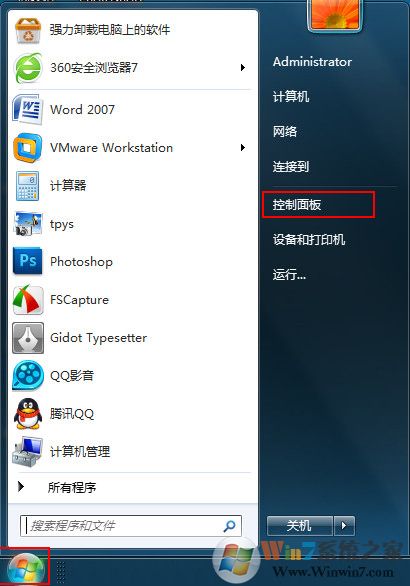 1、将我们准备好的u盘连接上电脑,接着点击“开始”键,在弹出来的菜单中选择“控制面板”,如下图所示: