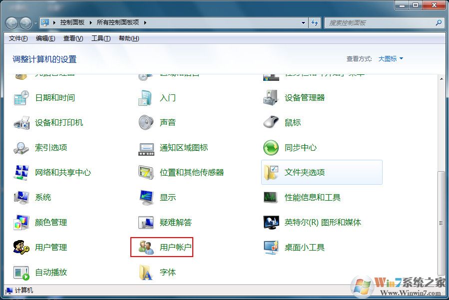 2、在所有控制面板项中,找到“用户账户”设置并且点击,如下图所示: