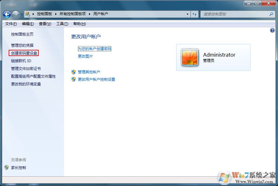 3、进入到用户账户设置界面中,点击左边的“创建密码重设盘”,如下图所示: