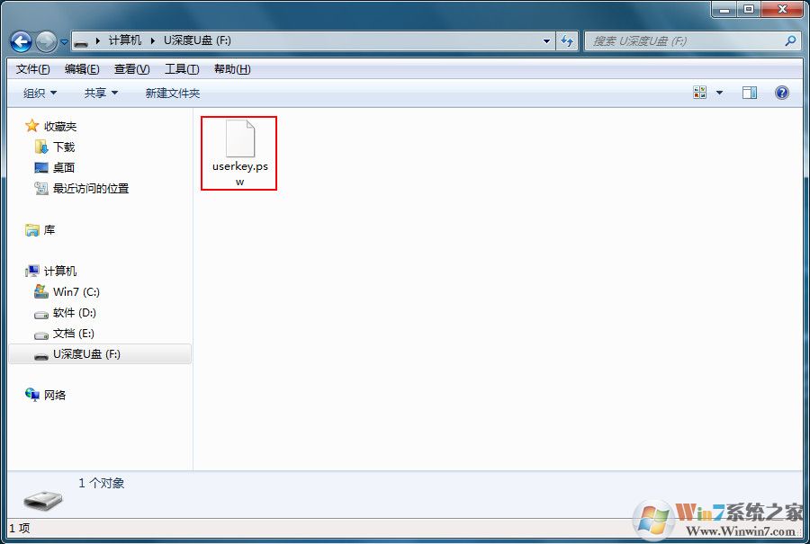 7、这是我们来到自己的u盘里面,可以u盘中有一个“userkey.psw”文件,这就是我们创建的文件,如下图所示: