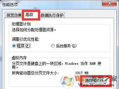 6、此时将打开“性能选项”窗口,切换到“高级”选项卡,点击“虚拟内存 更改”按钮。如图所示: