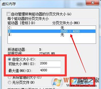 7、从打开的“虚拟内存”窗口中,选择要创建内存的分区,勾选“自定义大小”,在此设置虚拟内存大小为实际物理内存的2至4倍即可,点击“更改”按钮即可应用。
