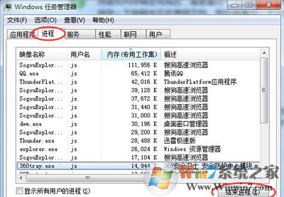 10、从打开的“Windows任务管理器”窗口中,切换到“进程”选项卡,找到占用系统资源较多的进程,选中并结束即可。