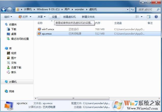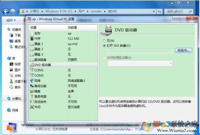 3、创建完成,如图,选中后点击设置,最关键一步,DVD打开ISO,浏览到下载的原版系统镜像(注意:Windows Virtual PC只支持32位的系统,所以下载的镜像需要32位 Win7安装版iso镜像_Win7 32位旗舰版纯净版),保存。