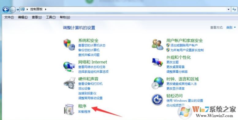 4、进入控制面板界面找到程序选项,点击下方的卸载程序按钮,进入到安装程序列表界面。