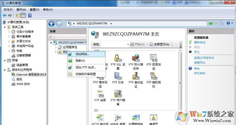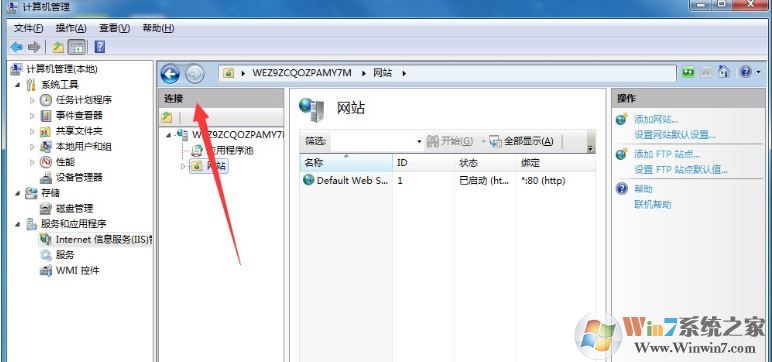 7、添加完成IIS服务之后,开始创建我们的FTP站点,右键点击我的电脑选择管理,然后找到服务和应用程序选项点击打开,接着点击Internet信息服务管理--此时我们可以看到右边出现了一个连接框。