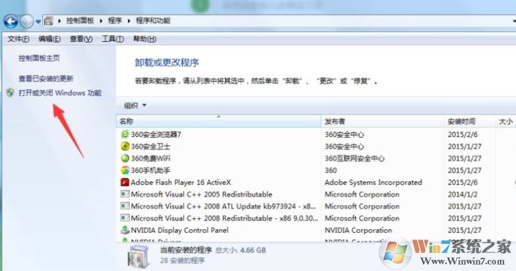 5、进入到程序和功能选项栏目,我们可以看到左上方的菜单栏中有一个打开或关闭Windows功能选项,点击进入。
