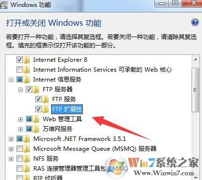 6、进入到打开或关闭Windows功能界面,我们在好到Internet信息服务,然后点击打开在FTP服务器前面打勾,也就是把其子菜单的FTP服务和FTP扩展性打勾,然后点击下方的确定按钮。