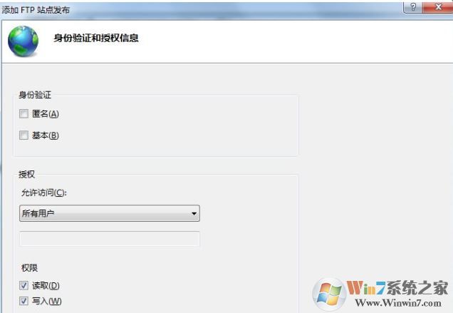 11、然后进入身份验证设置选项,我们根据个人用途选择身份验证的基本要求,已经用户的相关权限,设置完毕点击完成选项。此时会提醒我们FTP站点发布成功。