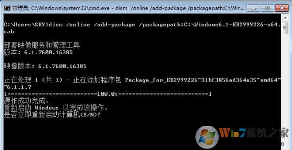 dism /online /add-package /packagepath:C:\Windows6.1-KB2999226-x64.cab