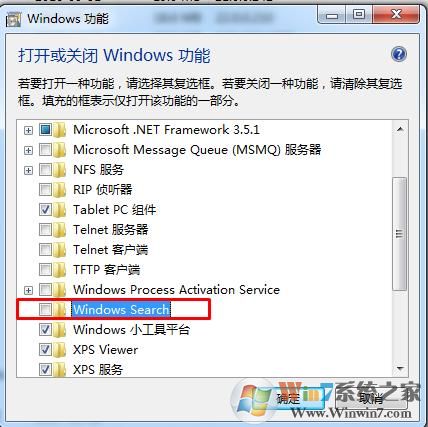在打开或关闭Windows功能中关闭Windows search功能