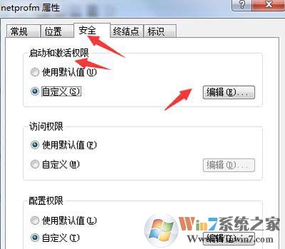 7、进入属性后,切换到“安全”选项卡,在“启动与激活权限”下方选择“自定义”,然后点击后面的“编辑”按钮;