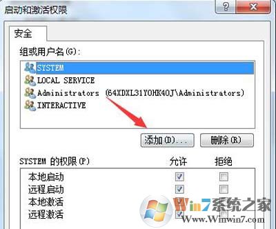 8、进入“启动和激活权限”后,点击组或用户名下方的“添加”按钮;