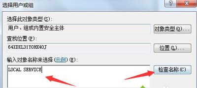 9、在“输入对象名称来选择”中输入“LOCAL SERVICE”,点击“检查名称”,点击确定;