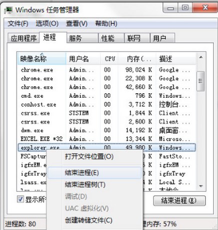 3、可以在进程中结束Explorer.exe,然后又新建一个运行的方法来尝试解决问题。