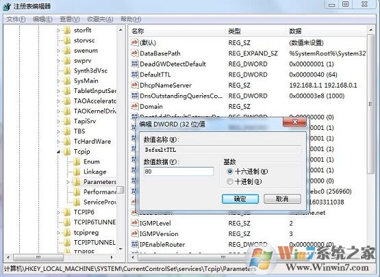 2、在运行命令框中输入注册表命令 如上图,确认之后进入注册表编辑器界面,首先我们依次选择HKEY_LOCAL_MACHINE,之后在选择HKEY_LOCAL_MACHINE\SYSTEM\CurrentControlSet\Services\Tcpip\Parameters选择DefaultTTL,改变值为80(16进制)确定即可,如下图: