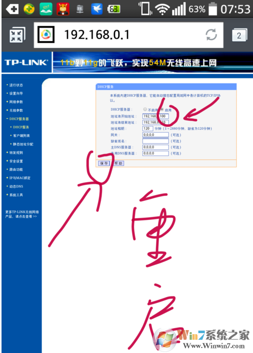 3、首先启用dhcp服务器,制定dhcp服务器的IP地址分配范围,IP地址租赁周期,其它没有特别需要不用填写。点击保存。