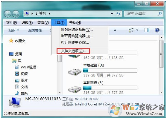 1、双击打开计算机图标,点击工具下面的“文件夹选项”;