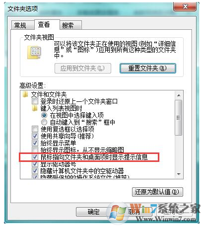 3、在查看标签下找到“鼠标指向文件夹和桌面项时显示提示信息”,并将其勾选,然后点击确定退出即可,现在将鼠标悬停在图标上就会显示提示信息了。