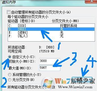4、在虚拟内存框中选择其他磁盘盘符,然后点击【自定义大小】,将初始大小设置为当前内存的大小,将最大值设置为 内存的3倍大小,然后点击【设置】;