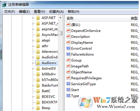2、在注册表中依次展开“HKEY_LOCAL_MACHINE\SYSTEM\CurrentControlSet\Services\Audiosrv”;