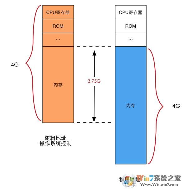 1、对于32位的windows操作系统,提供的逻辑地址寻址范围是4G,但是对于这4G的逻辑地址,又要划分出来一份给CPU寄存器、ROM的这些物理地址进行映射,那么剩下和内存条的物理地址进行映射的空间肯定没有4G了,如下图所示: