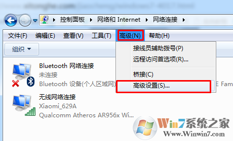 3、在网络连接界面工具栏上点击“高级”,选择“高级设置”;