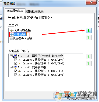 4、在高级设置窗口的“适配器和绑定”选卡的“连接”框内选定“本地连接”,然后点击右侧的向上箭头,接着“本地连接”就会跑到第一位,然后点击确定即可。