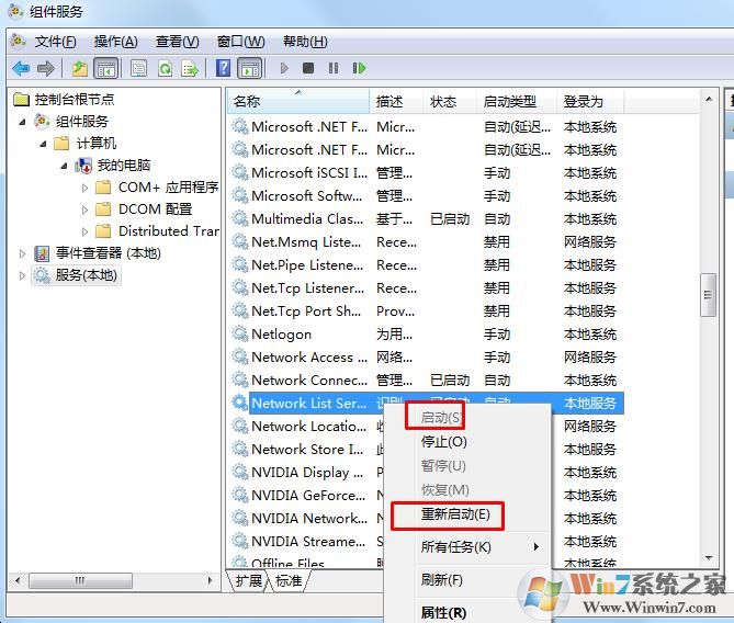 6.反回后,组件服务-服务-Network List Service-右键启用,如果已经启动的可以使用重新启动!