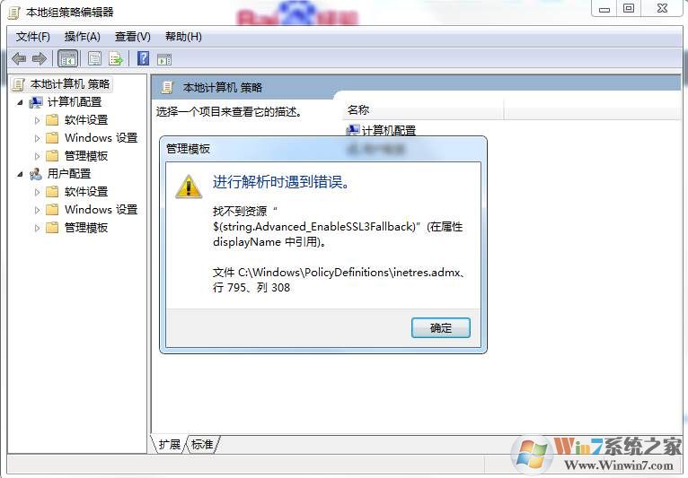 找不到资源,$(string.Advanced-EnableSSl3Fallback)”(在属性displayname中引用)。文件 C:\Wiindows\PolicyDefinitions\inetres.admx, 行 795,列 308 好像大多都是这个问题。