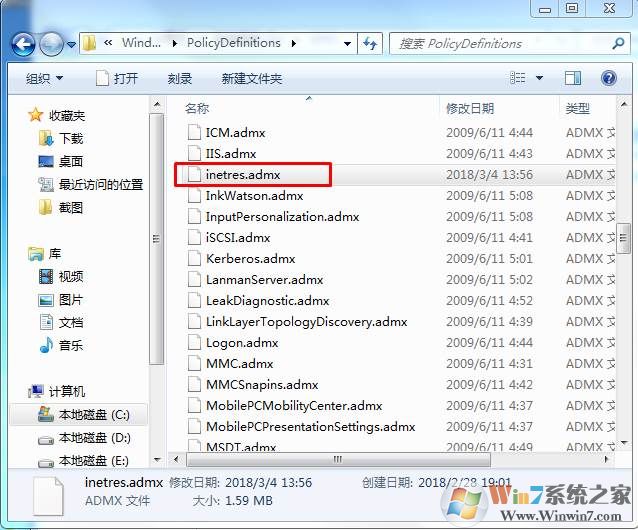 在同样的Win7系统也是IE11浏览器的电脑上复制:C:\windows\policyDefinitions\inetres.admx文件,然后拷贝到目标电脑上覆盖该文件即可;