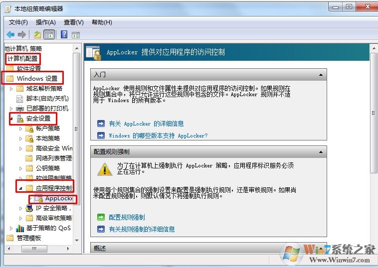 在此依次展开“计算机配置——Windows设置——安全设置——应用程序控制策略——AppLocker”分支(,点选AppLocker,在右侧出现一个“配置规则限制”窗口。