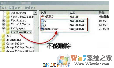 还是需要在注册表中来进行操作,在开始菜单的搜索栏中输入“regedit”进入注册表,依次找到如下键值:HKEY_CURRENT_USERSoftwareMicrosoftWindowsCurrentVersionExplorerWordWheelQuery,删除右边子项中除了名为默认的项即可。如果怕删错可以先选择上方工具栏的“导出”功能来备份注册表,有问题时再恢复即可。