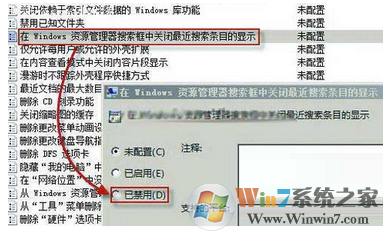 第二步:打开“用户配置→管理模板→Windows组件→Windows资源管理器”,选择右侧窗格中的“在Windows资源管理器搜索框中关闭最近搜索条目的显示”项目,双击该项目打开属性窗口,在这里选择“已启用”,最后单击“确定”即可启用该功能,这样以后就不会自动保存搜索记录了。