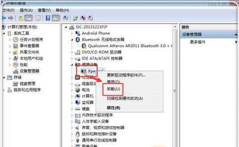 2、然后在管理中,选择设备管理器,右键点击含有你手机标识的图标,比如我的Xpeir s,然后点击“卸载”
